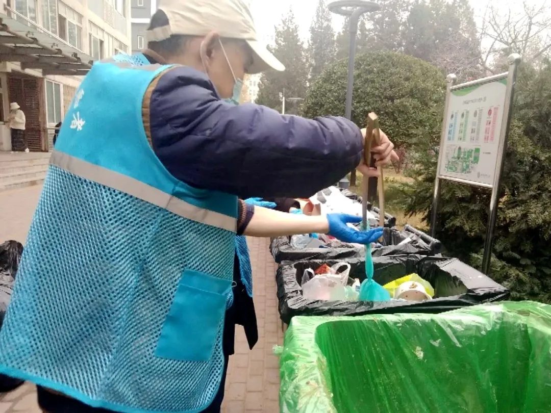 为确保早晚高峰时段同学们垃圾倾倒投放正确,你们穿着蓝色马甲,不论风雨,不惧严寒,用自己的耐心引导同学们正确分类,形了一道靓丽的风景线。