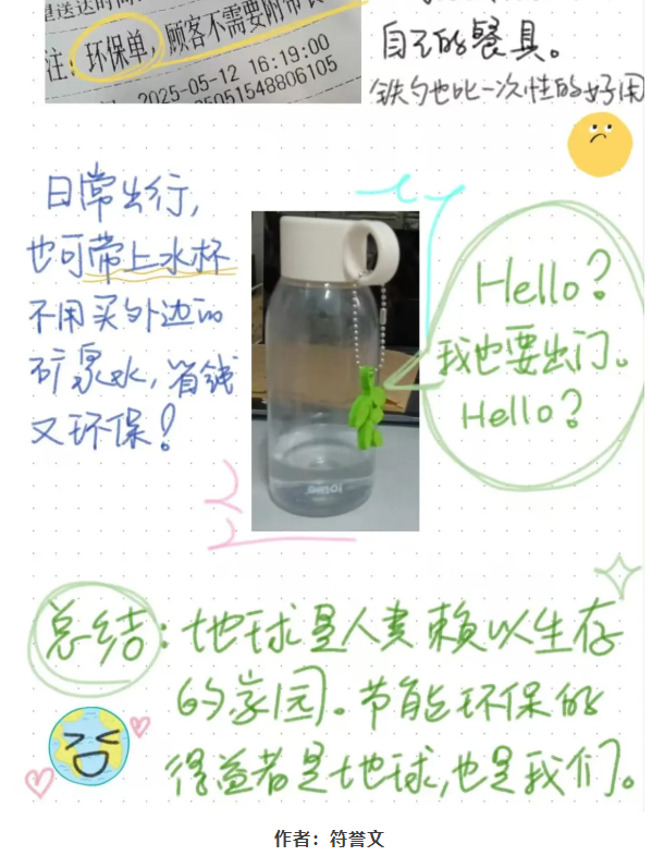 手帐制作区,大家纷纷拿起画笔和贴纸,将对环保的理解与期待记录在一页页精美的纸张上。同学们绘制了地球的生态变化,从郁郁葱葱的森林到日渐荒芜的土地,对比强烈的画面引发人们对环境保护的深刻思考。