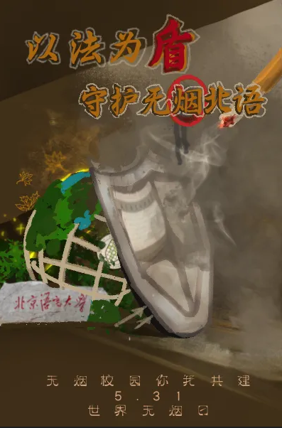 海报左侧用香烟、烟雾、病菌和受损肺部等元素,直观展现吸烟危害,传递出吸烟对健康的不良影响;右侧,大学生们姿态坚定,其中一人持绘有法律天平图案的盾牌,象征以法律为武器,捍卫无烟校园。背景为北京语言大学东门和综合楼建筑简笔画,代表学校特色。
